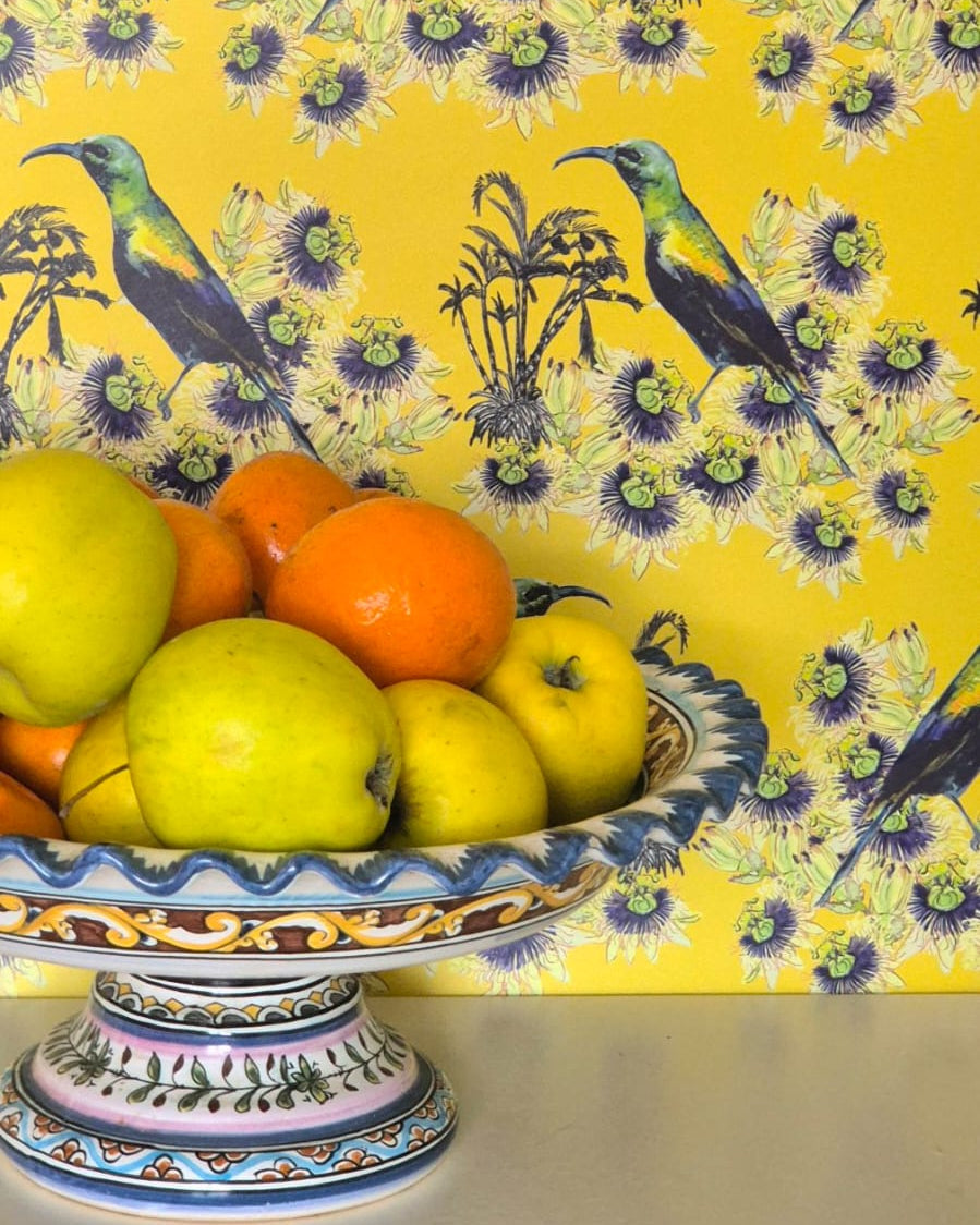 Infuse your interior with the vibrant landscapes of Kenya through this striking Kirimiri Sunbird wallpaper. Intricate passion flowers intertwine with graceful palm trees, alive with village weaver birds, while a glossy golden-winged Bronze Sunbird takes centre stage. This captivating design captures the lush, exotic beauty of an African garden, creating a space full of warmth, colour, and natural elegance.