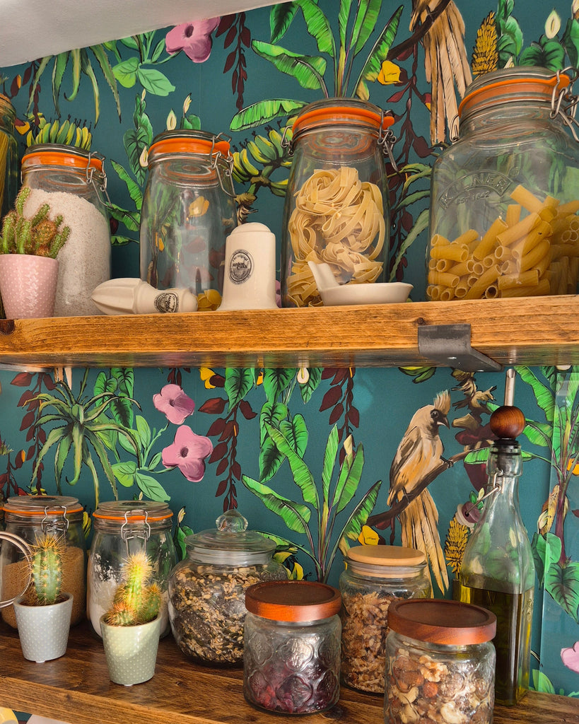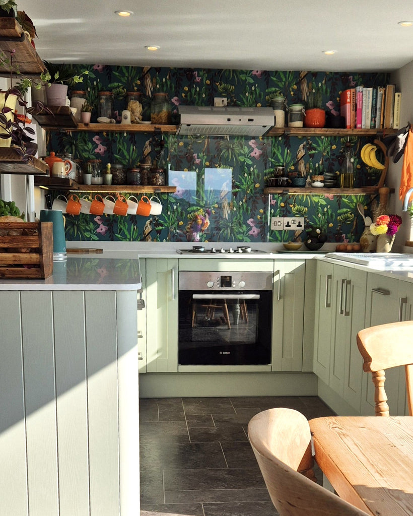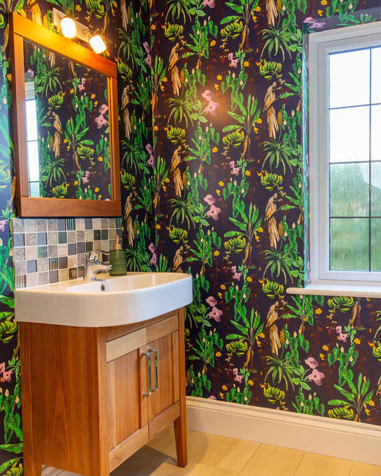 Discover the allure of Kitito Wallpaper, a high-end artistic design that stands as one of our bestsellers. This bold wallpaper features lush tropical plants and charming mousebirds, creating a vibrant statement piece perfect for a stunning and colourful interior transformation.